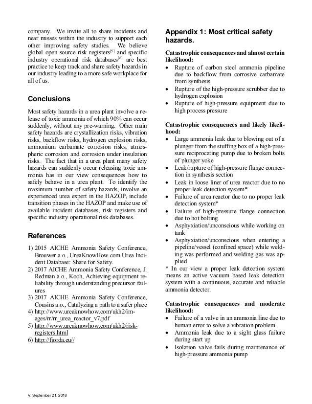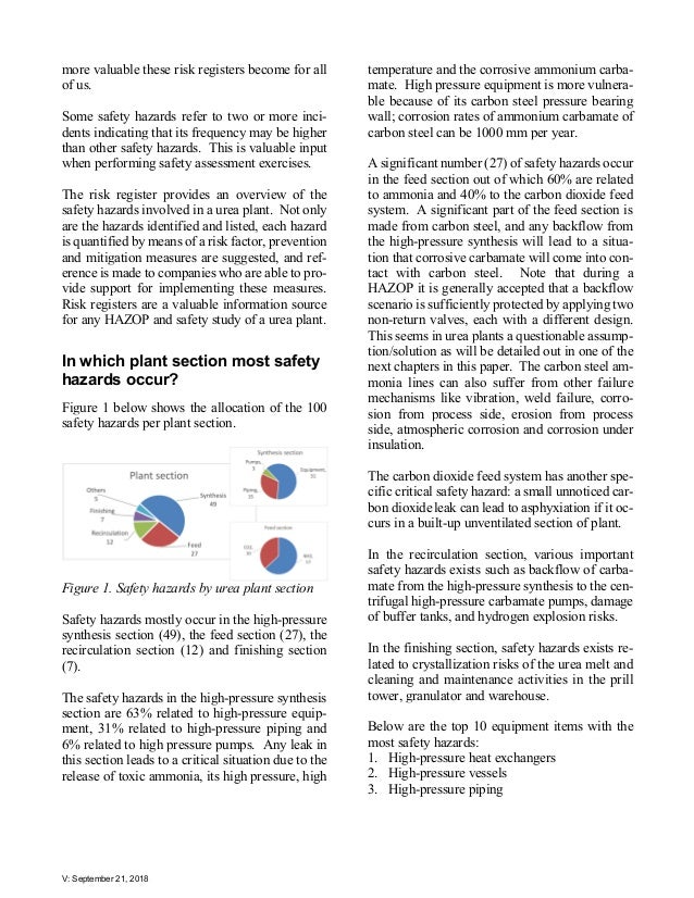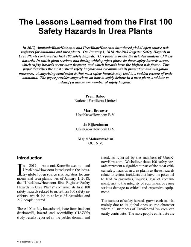 - 2. V: September 21, 2018 The Lessons Learned from the First 100 Safety Hazards In Urea Plants In 2017, AmmoniaKnowHow.com and UreaKnowHow.com introduced global open source risk registers for ammonia and urea plants. On January 1, 2018, the Risk Register Safety Hazards in Urea Plants contained its first 100 safety hazards. This paper provides the detailed analysis of these hazards: In which plant sections and during which project phase do these safety hazards occur, which safety hazards occur most frequent, and which hazards have the highest risk factor. This paper describes the most critical safety hazards and recommends its prevention and mitigation measures. A surprising conclusion is that most safety hazards may lead to a sudden release of toxic ammonia. The paper provides suggestions on how to safely behave in a urea plant, and how to identify a maximum number of safety hazards. Prem Baboo National Fertilizers Limited Mark Brouwer UreaKnowHow.com B.V. Jo Eijkenboom UreaKnowHow.com B.V. Majid Mohammadian OCI N.V. Introduction n 2017, AmmoniaKnowHow.com and UreaKnowHow.com introduced to the indus- try global open source risk registers for am- monia and urea plants. As of January 1, 2018, the “UreaKnowHow.com Risk Register Safety Hazards in Urea Plants” contained its first 100 safety hazards related to more than 100 safety in- cidents, which led to at least 65 casualties and 217 people injured. These 100 safety hazards originate from incident databases[1] , hazard and operability (HAZOP) study results reported in the public domain and incidents reported by the members of UreaK- nowHow.com. We believe these 100 safety haz- ards represent a significant part of the most criti- cal safety hazards in urea plants as these hazards relate to serious incidents that have the potential to lead to casualties, injuries, loss of contain- ment, risk to the integrity of equipment or cause serious damage to critical and expensive equip- ment. The number of safety hazards grows each month, mainly due to its global open source character where all members of UreaKnowHow.com can easily contribute. The more people contribute the I