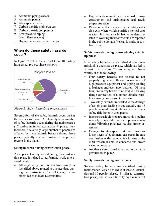 - 4. V: September 21, 2018 4. Ammonia piping/valves 5. Ammonia pumps 6. Atmospheric tanks 7. Carbon dioxide piping/valves 8. Carbon dioxide compressor 9. Low-pressure piping (melt, flare headers) 10. High-pressure carbamate pumps When do these safety hazards occur? In Figure 2 below the split of these 100 safety hazards per project phase is shown. Figure 2. Safety hazards by project phase Seventy-four of the safety hazards occur during the operations phase. A relatively large number of safety hazards occur during the maintenance (16) and commissioning/start-up (9) phase. Fur- thermore, a relatively large number of people are affected by these hazards because during these phases typically a larger number of people are present in the plant. Safety hazards during construction phase An important safety hazard during the construc- tion phase is related to performing work at ele- vated heights. • Although only one construction hazard is identified above related to one accident dur- ing the construction of a prill tower, that in- cident led to at least 12 casualties. • High elevation work is a major risk during construction and maintenance and needs proper attention. • Please note that elevated work safety risks also exist when working inside a vertical urea reactor. It is remarkable that no incidents re- lated to working in urea reactors are reported in the public domain (yet) as it is also a con- fined space. Safety hazards during commissioning / start- up phase Nine safety hazards are identified during com- missioning and start-up phase, which has led to at least 1 casualty and 20 people injured. Note- worthy are the following: • Four safety hazards are related to not properly tightening flange connections of high-pressure equipment and piping leading to leakages and even two ruptures. Of these four, one safety hazard is related to a leaking flange connection of a carbon dioxide pipe- line causing one person to pass out. • Two safety hazards are related to the damage of a sight glass leading to one casualty and 18 people injured. Sight glasses are a major safety risk factor in urea plants. • In one case a high-pressure ammonia pipeline severely vibrated during start up flow condi- tions: Vibrating pipelines require proper at- tention. • Damage to atmospheric storage tanks or loose liners of equipment can occur in case one flushes with steam, which for one or the other reason is able to condense and create vacuum pressure. • Another safety hazard is related to the high- pressure flush pump. Safety hazards during maintenance Sixteen safety hazards are identified during maintenance, which has led to at least 20 casual- ties and 19 people injured. Similar to construc- tion phase, one sees a relatively high number of