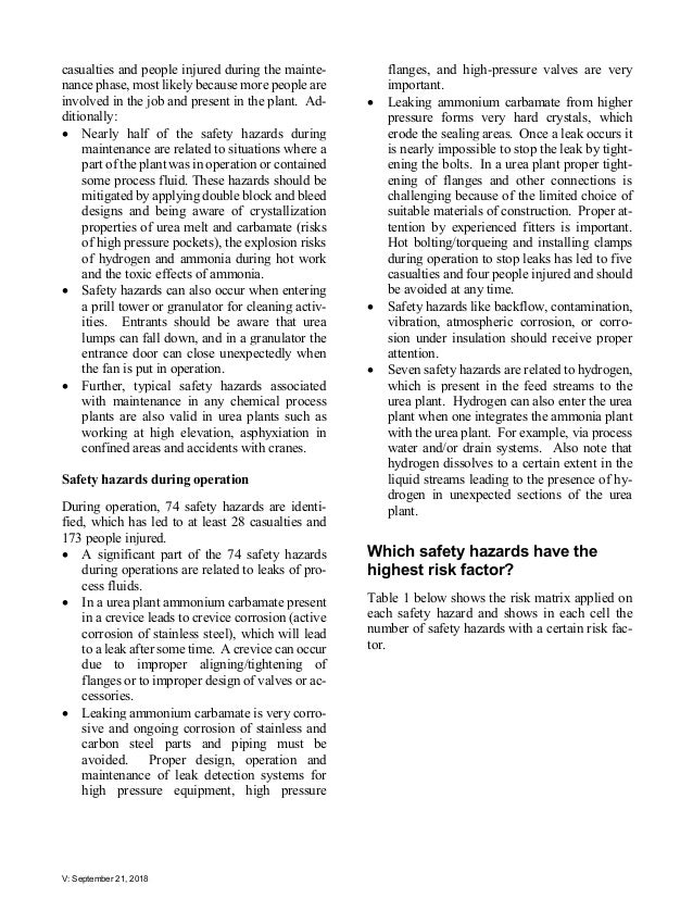 - 5. V: September 21, 2018 casualties and people injured during the mainte- nance phase, most likely because more people are involved in the job and present in the plant. Ad- ditionally: • Nearly half of the safety hazards during maintenance are related to situations where a part of the plant was in operation or contained some process fluid. These hazards should be mitigated by applying double block and bleed designs and being aware of crystallization properties of urea melt and carbamate (risks of high pressure pockets), the explosion risks of hydrogen and ammonia during hot work and the toxic effects of ammonia. • Safety hazards can also occur when entering a prill tower or granulator for cleaning activ- ities. Entrants should be aware that urea lumps can fall down, and in a granulator the entrance door can close unexpectedly when the fan is put in operation. • Further, typical safety hazards associated with maintenance in any chemical process plants are also valid in urea plants such as working at high elevation, asphyxiation in confined areas and accidents with cranes. Safety hazards during operation During operation, 74 safety hazards are identi- fied, which has led to at least 28 casualties and 173 people injured. • A significant part of the 74 safety hazards during operations are related to leaks of pro- cess fluids. • In a urea plant ammonium carbamate present in a crevice leads to crevice corrosion (active corrosion of stainless steel), which will lead to a leak after some time. A crevice can occur due to improper aligning/tightening of flanges or to improper design of valves or ac- cessories. • Leaking ammonium carbamate is very corro- sive and ongoing corrosion of stainless and carbon steel parts and piping must be avoided. Proper design, operation and maintenance of leak detection systems for high pressure equipment, high pressure flanges, and high-pressure valves are very important. • Leaking ammonium carbamate from higher pressure forms very hard crystals, which erode the sealing areas. Once a leak occurs it is nearly impossible to stop the leak by tight- ening the bolts. In a urea plant proper tight- ening of flanges and other connections is challenging because of the limited choice of suitable materials of construction. Proper at- tention by experienced fitters is important. Hot bolting/torqueing and installing clamps during operation to stop leaks has led to five casualties and four people injured and should be avoided at any time. • Safety hazards like backflow, contamination, vibration, atmospheric corrosion, or corro- sion under insulation should receive proper attention. • Seven safety hazards are related to hydrogen, which is present in the feed streams to the urea plant. Hydrogen can also enter the urea plant when one integrates the ammonia plant with the urea plant. For example, via process water and/or drain systems. Also note that hydrogen dissolves to a certain extent in the liquid streams leading to the presence of hy- drogen in unexpected sections of the urea plant. Which safety hazards have the highest risk factor? Table 1 below shows the risk matrix applied on each safety hazard and shows in each cell the number of safety hazards with a certain risk fac- tor.