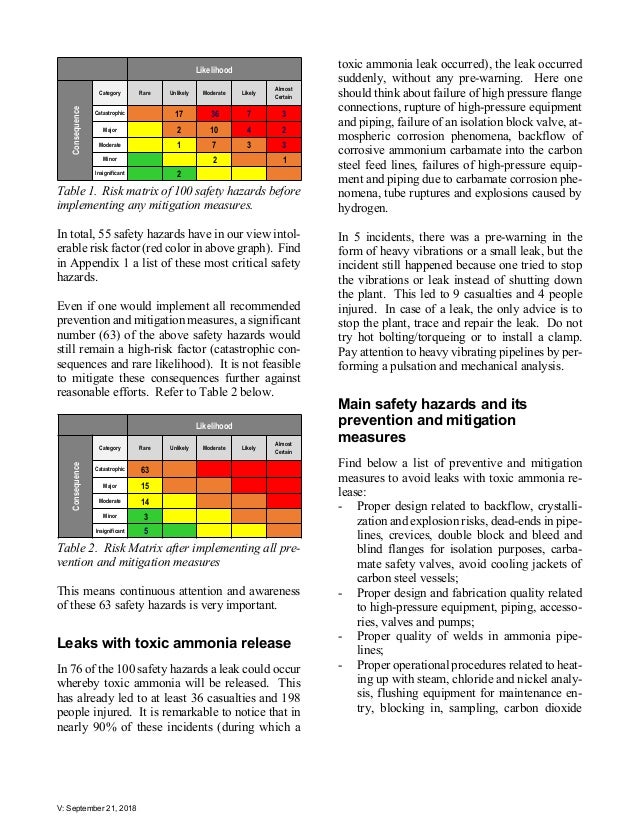 - 6. V: September 21, 2018 Table 1. Risk matrix of 100 safety hazards before implementing any mitigation measures. In total, 55 safety hazards have in our view intol- erable risk factor (red color in above graph). Find in Appendix 1 a list of these most critical safety hazards. Even if one would implement all recommended prevention and mitigation measures, a significant number (63) of the above safety hazards would still remain a high-risk factor (catastrophic con- sequences and rare likelihood). It is not feasible to mitigate these consequences further against reasonable efforts. Refer to Table 2 below. Table 2. Risk Matrix after implementing all pre- vention and mitigation measures This means continuous attention and awareness of these 63 safety hazards is very important. Leaks with toxic ammonia release In 76 of the 100 safety hazards a leak could occur whereby toxic ammonia will be released. This has already led to at least 36 casualties and 198 people injured. It is remarkable to notice that in nearly 90% of these incidents (during which a toxic ammonia leak occurred), the leak occurred suddenly, without any pre-warning. Here one should think about failure of high pressure flange connections, rupture of high-pressure equipment and piping, failure of an isolation block valve, at- mospheric corrosion phenomena, backflow of corrosive ammonium carbamate into the carbon steel feed lines, failures of high-pressure equip- ment and piping due to carbamate corrosion phe- nomena, tube ruptures and explosions caused by hydrogen. In 5 incidents, there was a pre-warning in the form of heavy vibrations or a small leak, but the incident still happened because one tried to stop the vibrations or leak instead of shutting down the plant. This led to 9 casualties and 4 people injured. In case of a leak, the only advice is to stop the plant, trace and repair the leak. Do not try hot bolting/torqueing or to install a clamp. Pay attention to heavy vibrating pipelines by per- forming a pulsation and mechanical analysis. Main safety hazards and its prevention and mitigation measures Find below a list of preventive and mitigation measures to avoid leaks with toxic ammonia re- lease: - Proper design related to backflow, crystalli- zation and explosion risks, dead-ends in pipe- lines, crevices, double block and bleed and blind flanges for isolation purposes, carba- mate safety valves, avoid cooling jackets of carbon steel vessels; - Proper design and fabrication quality related to high-pressure equipment, piping, accesso- ries, valves and pumps; - Proper quality of welds in ammonia pipe- lines; - Proper operational procedures related to heat- ing up with steam, chloride and nickel analy- sis, flushing equipment for maintenance en- try, blocking in, sampling, carbon dioxide Likelihood Consequence Category Rare Unlikely Moderate Likely Almost Certain Catastrophic 17 36 7 3 Major 2 10 4 2 Moderate 1 7 3 3 Minor 2 1 Insignificant 2 Likelihood Consequence Category Rare Unlikely Moderate Likely Almost Certain Catastrophic 63 Major 15 Moderate 14 Minor 3 Insignificant 5