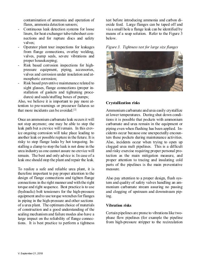 - 7. V: September 21, 2018 contamination of ammonia and operation of flares, ammonia detection sensors; - Continuous leak detection systems for loose liners, for heat exchanger tube-tubesheet con- nections and for rupture discs and safety valves; - Operator plant tour inspections for leakages from flange connections, overlay welding, valves, pump seals, severe vibrations and proper housekeeping; - Risk based corrosion inspections for high- pressure equipment, piping, accessories, valves and corrosion under insulation and at- mospheric corrosion; - Risk based preventive maintenance related to sight glasses, flange connections (proper in- stallation of gaskets and tightening proce- dures) and seals/stuffing boxes of pumps; Also, we believe it is important to pay more at- tention to pre-warnings or precursor failures so that more incidents can be avoided.[2] Once an ammonium carbamate leak occurs it will not stop anymore; one may be able to stop the leak path but a crevice will remain. In this crev- ice ongoing corrosion will take place leading to another leak or possible rupture in the future. It is risky to stop flange leaks by hot torqueing. In- stalling a clamp to stop the leak is not done in the urea industry as one cannot assure no crevice will remain. The best and only advice is: In case of a leak one should stop the plant and repair the leak. To realize a safe and reliable urea plant, it is therefore important to pay proper attention to the design of flange connections and tighten flange connections in the right manner and with the right torque and right sequence. Best practice is to use (hydraulic) bolt tensioners for the high-pressure equipment and to use torque wrenches for flanges in piping in the high-pressure and other sections of a urea plant. The optimum choice of materials of construction and a good understanding of the sealing mechanism and failure modes also have a large impact on the reliability of flange connec- tions. It is best practice to perform a tightness test before introducing ammonia and carbon di- oxide feed. Large flanges can be taped off and via a small hole a flange leak can be identified by means of a soap solution. Refer to the Figure 3 below. Figure 3. Tightness test for large size flanges Crystallization risks Ammonium carbamate and urea easily crystallize at lower temperatures. During shut down condi- tions it is possible that pockets with ammonium carbamate and urea remain in the equipment or piping even when flushing has been applied. In- cidents occur because one unexpectedly encoun- ters these pockets during maintenance activities. Also, incidents occur when trying to open up clogged urea melt pipelines. This is a difficult and risky exercise requiring proper personal pro- tection as the main mitigation measure, and proper attention to tracing and insulating cold parts of the pipelines is the main preventative measure. Also pay attention to a proper design, flush sys- tem and quality of safety valves handling an am- monium carbamate stream assuring no passing and clogging of upstream and downstream pip- ing. Vibration risks Certain pipelines are prone to vibrations like two- phase flow pipelines (for example the pipeline from high-pressure stripper to the recirculation