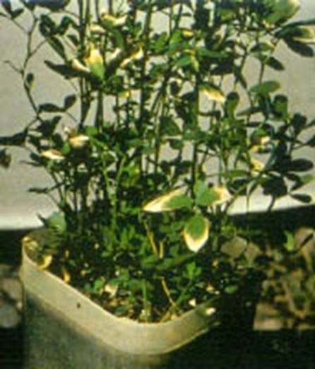 | Soybean | Yellow leaves, chlorotic between veins, downward curling of leaf tips, crinkling of leaves, dieback of tips, no flowering, roots stunted. |