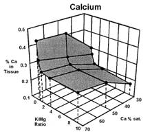 - Calcium uptake (Figure 3) is also reduced as the K:Mg ratio increases. It appears that the lower Ca uptake is due to the K:Mg ratio. However, it is possible that the reduced Ca uptake could be simply due to increasing total amounts of K and/or Mg, or the ratio of these totals to the amount of Ca available. In neither case does the percent Ca saturation of the soil have a significant effect on K or Mg uptake.