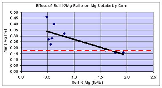 - Notice that the uptake of Mg drops dramatically as the K:Mg ratio increases (Figure 2). By the time the K:Mg ratio reaches about 1.5, the Mg uptake has decreased significantly.