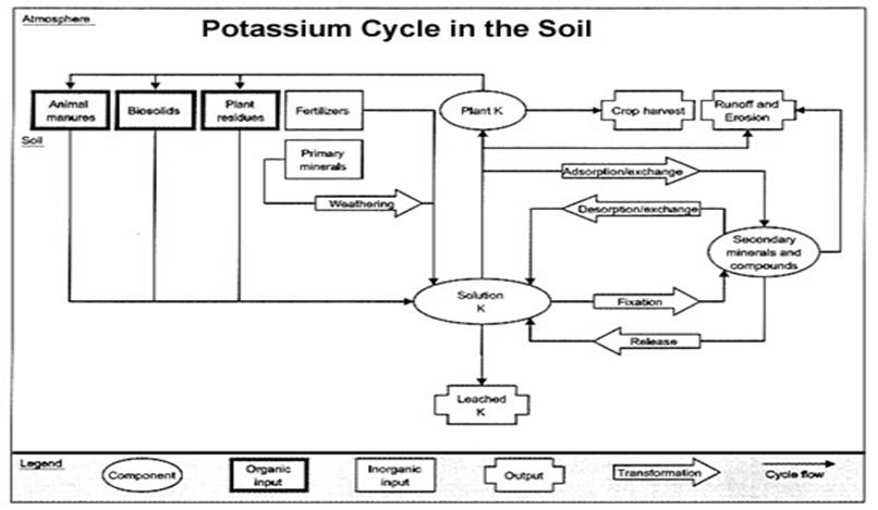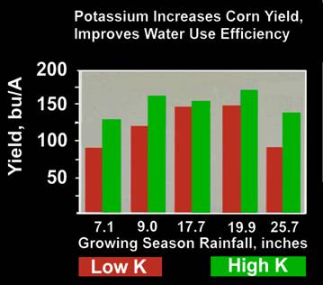 Soil Moisture: K is transported within the soil and is absorbed by plant roots in the soil water. Therefore a water deficiency results in less K absorption.