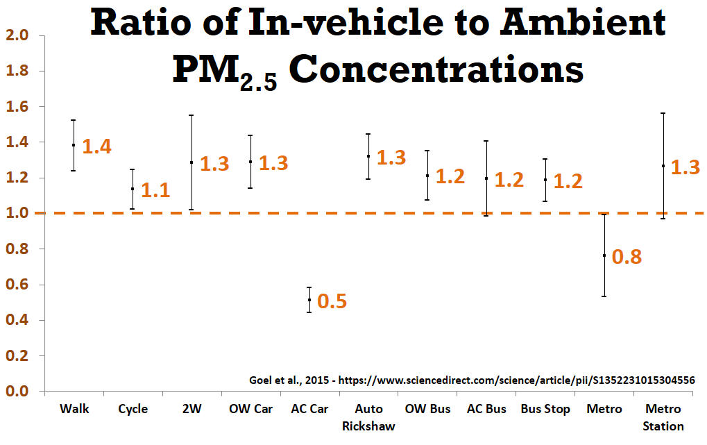 If this exercise is repeated for long periods and in multiple modes (cars, buses, cycle, motorcycle, and walking), we can establish a heat map of pollution on the roads. It is very important to note that measurements collected from this exercise are biased towards sources on the road and one land use (roads) in the city, which by design cannot be compared to the data from the ambient monitoring stations or to the ambient standards. However, this exercise is complementary, which can help create a better understanding of how much pollution travelers are exposed to.
